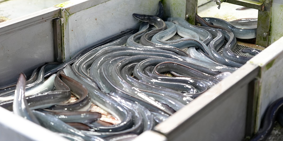 鰻の選別作業風景です。商品として出荷するためには、大きさを揃える必要があります。熟練の作業者が確かな目と触った感覚を頼りに、細かく選別していきます。