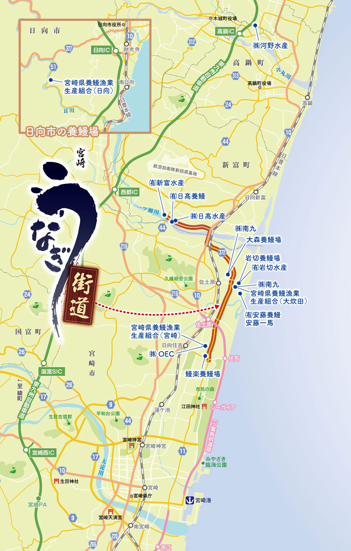 宮崎県ではうなぎの養殖が盛んで、全国第3位の生産量を誇ります。その中心となるのが、宮崎市の塩路、佐土原町から児湯郡新富町にかけての通称「うなぎ街道」沿いのエリアです。